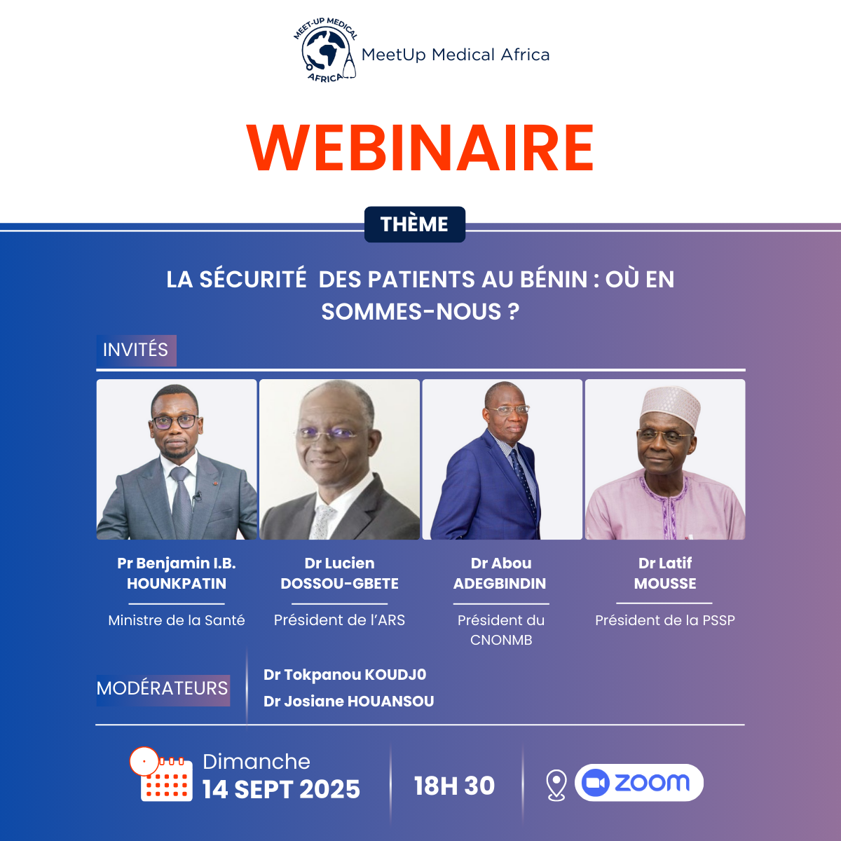 Ce webinaire, organisé par MeetUp Medical Africa, est centré sur le thème crucial de « La Sécurité des Patients au Bénin : Où en sommes-nous ? »